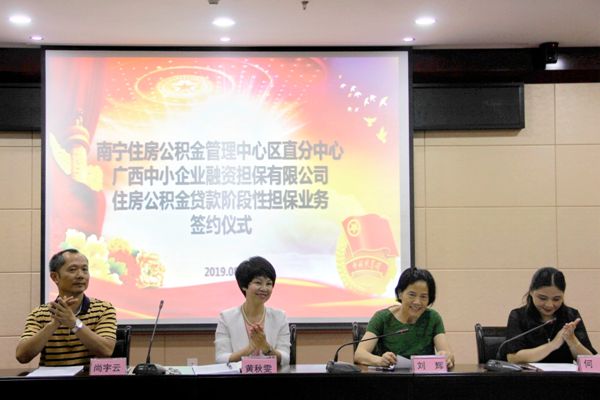 2019年8月21日,金投集團下屬廣西中小企業(yè)融資擔保公司(以下簡稱擔保公司)與南寧住房公積金管理中心區(qū)直分中心(以下簡稱區(qū)直公積金中心)舉行住房公積金貸款階段性擔保業(yè)務簽約儀式。擔保公司副總經理黃秋雯與區(qū)直公積金中心副主任劉輝分別代表雙方在儀式上簽約。